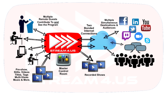 We have built a specialized production suite using decades of live-event production experience, as well as heaping amounts of technical know how, to bring remote guests into our production, craft a polished television production, and send it back out to the internet using specialized, dual bonded internet connections to minimize any chance of congestion or drops. We also have cloud redistribution to send it to multiple destinations if needed, and we always record the show locally at a very high quality in case there are internet issues out of our control.